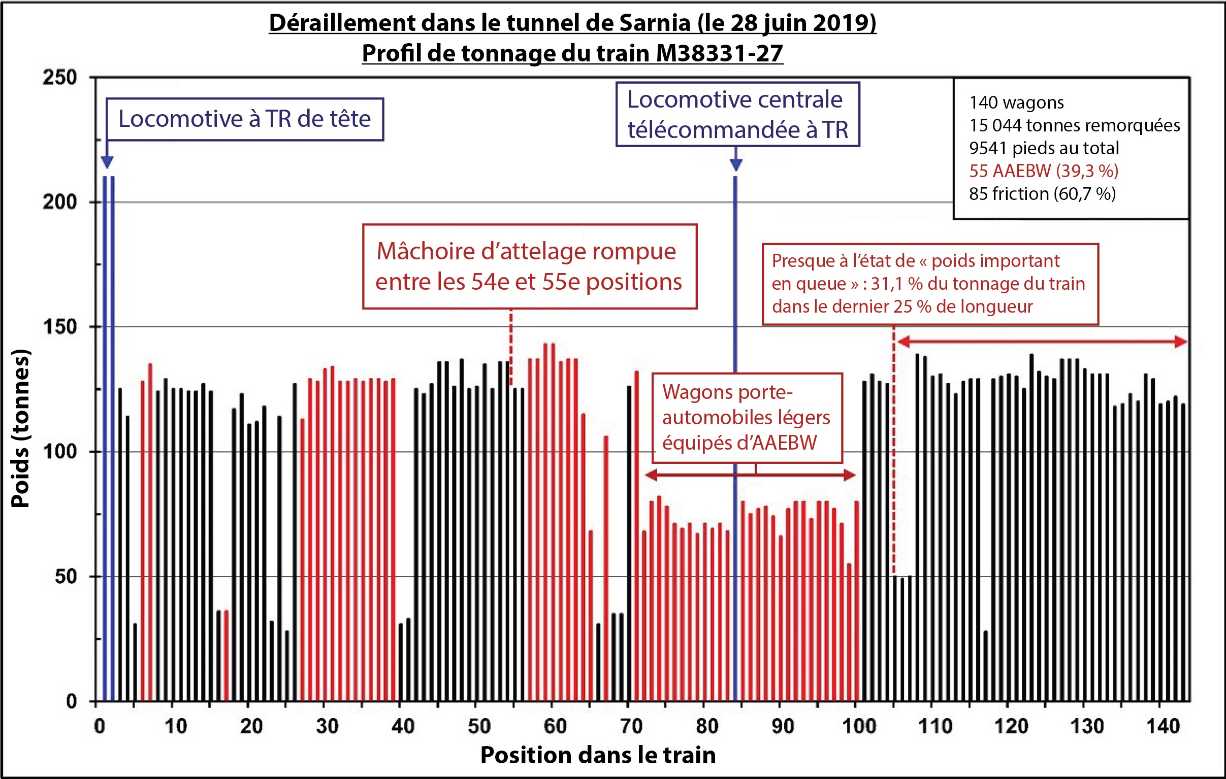 - Les wagons porte-automobiles équipés d’AAEBW ont ensuite été réagencés pour être portés en queue de train depuis leurs positions d’origine devant et derrière la locomotive télécommandée à TR. Avec le même profil de voie et avec les commandes de conduite et la constitution du train demeurant par ailleurs conformes aux données du consignateur d’événements de la locomotive et à la composition connue du train, la force de compression maximale prévue s’exerçant au bout A (avant) du wagon DJJX 30478 (53e position) serait considérablement réduite, à environ 235 kips.