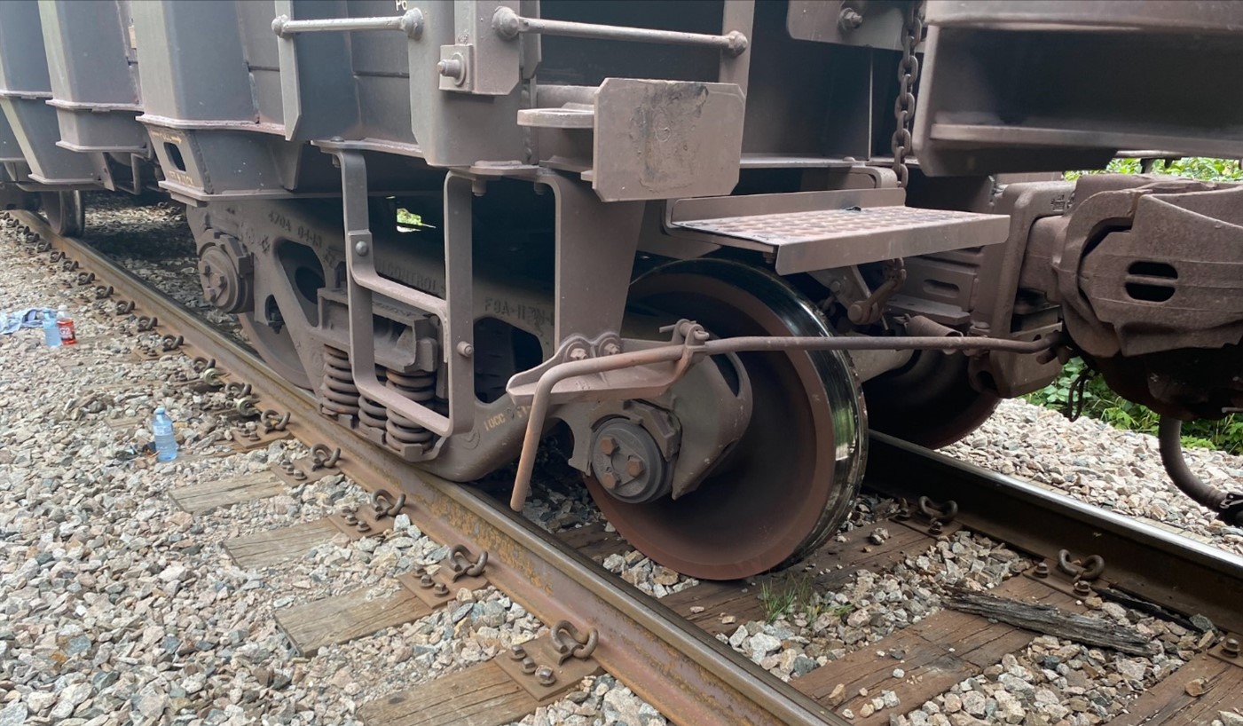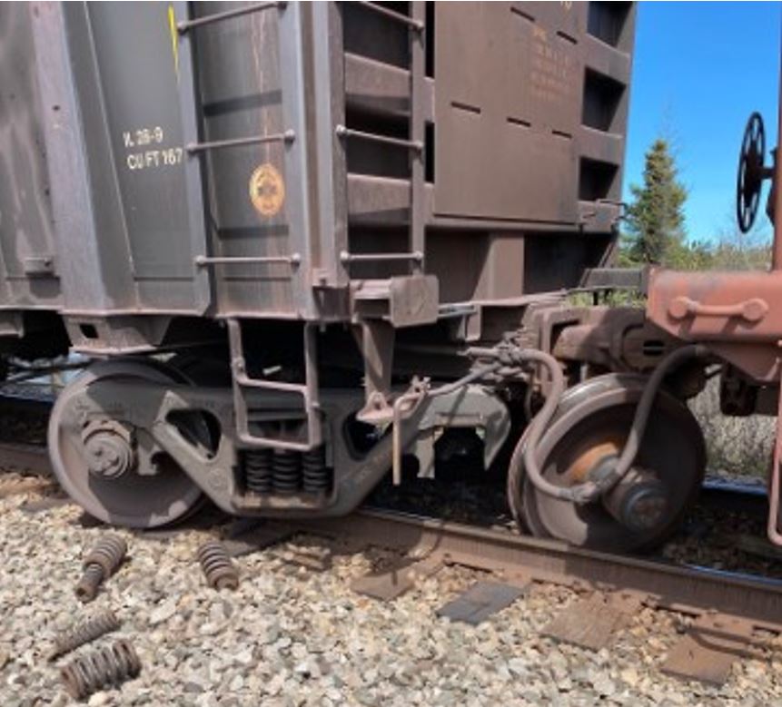 Un autre événement semblable est survenu le 7 juin 2022Note de bas de page 7. Le train CL-379D, composé de 3 locomotives équipées de moteurs de traction à CA et de 240 wagons, a déraillé à Oreway (Terre-Neuve-et-Labrador) lors d’une manœuvre d’arrêt, entraînant la mise en portefeuille de 4 wagons et endommageant 22 autres wagons (figure 2). Le ML, qui comptait environ 4 ans d’expérience, avait appliqué le freinage rhéostatique au maximum dans un très court délai et effectué un serrage minimal des freins automatiques. Cette manœuvre n’avait pas permis au jeu d’attelage des wagons de s’ajuster et avait généré des forces excessives de compression dans le train.