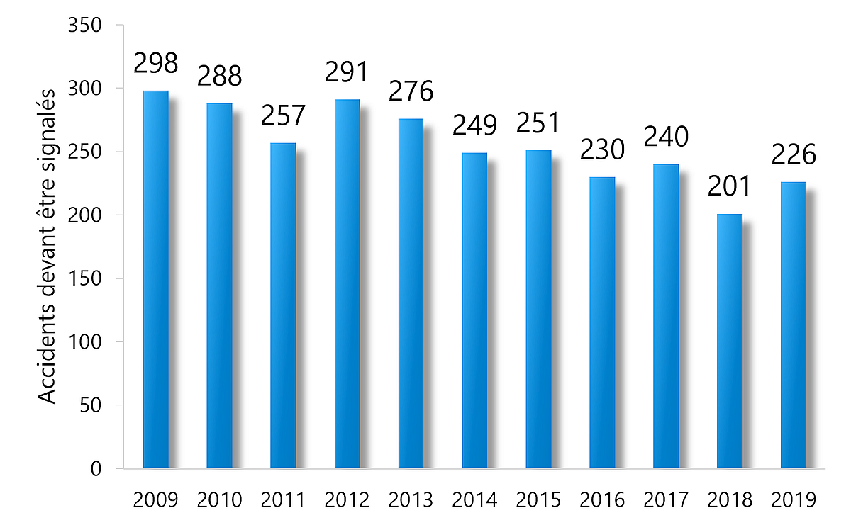 Il est à noter que certaines caractéristiques des données limitent l’analyse statistique et la détermination de tendances émergentes. Ces caractéristiques sont, entre autres, le petit nombre d’accidents et d’incidents, la grande variabilité des données d’une année à l’autre, et les changements à la réglementation et aux définitions. Nous rappelons au lecteur de tenir compte de ces limites durant la lecture du présent sommaire afin d’éviter de tirer des conclusions que l’analyse statistique ne pourra appuyer.