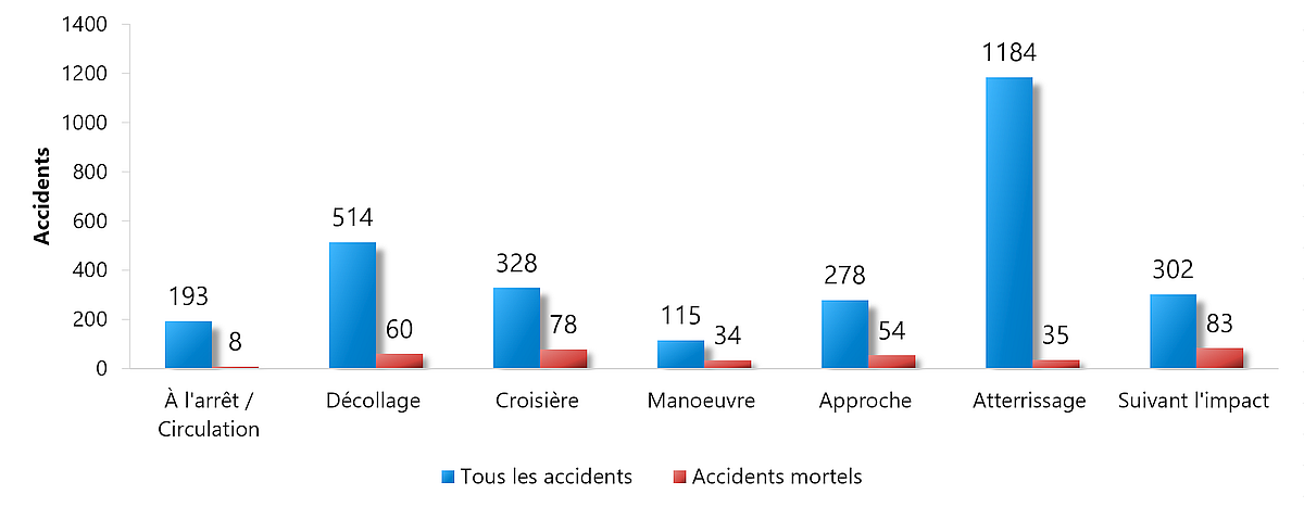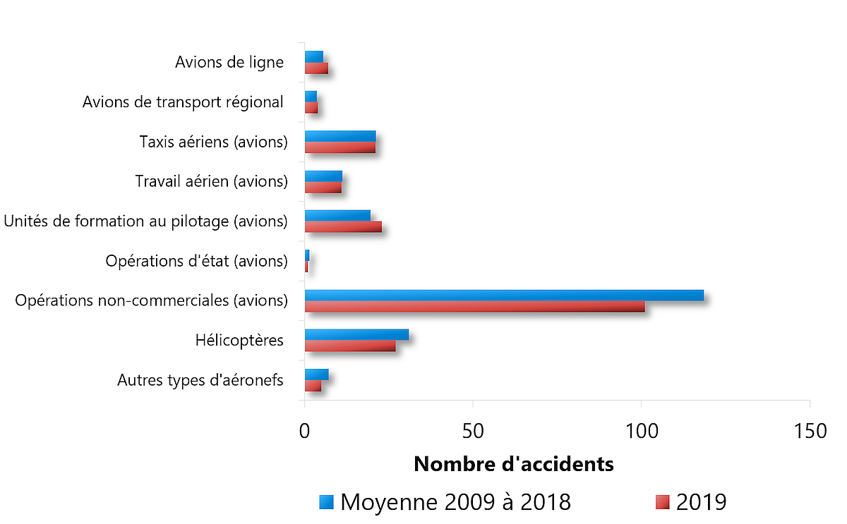 Des avions exploités à titre commercial ont été en cause dans 83 accidents en 2019 (tableau 1). Ce total est supérieur aux 66 accidents de ce type en 2018, mais demeure inférieur de 6 % à la moyenne de 88 accidents par année enregistrée au cours des 10 années de 2009 à 2018.