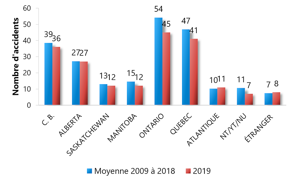 La figure 3 montre le nombre d’accidents mettant en cause des avions immatriculés au Canada (tableau 8), par province ou territoire. On a signalé 45 accidents d’aéronefs immatriculés au Canada en Ontario en 2019, ce qui est inférieur de 17 % au nombre d’accidents moyen (54) enregistré au cours de la période de 2009 à 2018. Il y a eu plus d’accidents au Nouveau-Brunswick (compris dans « Atlantique » dans figure 3) (8) que la moyenne pour les 10 années précédentes (3).