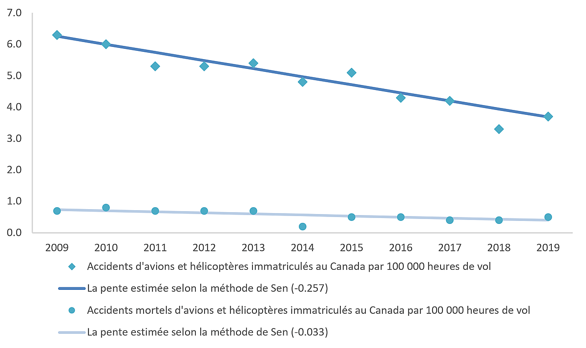 | Année | Accidents d'avions et hélicoptères immatriculés au Canada par 100 000 heures de vol | La pente estimée selon la méthode de Sen (−0.257) | Accidents mortels d'avions et hélicoptères immatriculés au Canada par 100 000 heures de vol | La pente estimée selon la méthode de Sen (−0.033) |