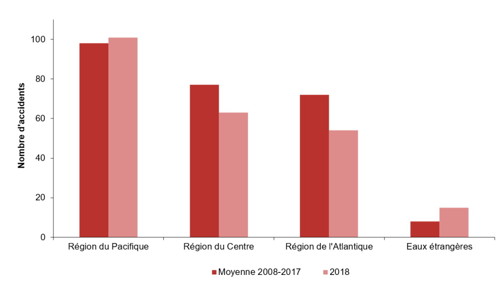 On a enregistré 233 accidents de navigation en 2018, soit le même nombre qu'en 2017 et en baisse de 9 % par rapport à la moyenne de 2008 à 2017 (255). La plupart des accidents de navigation mettaient en cause des bateaux de pêche (28 %) et des navires qui transportent des cargaisons solides (18 %).