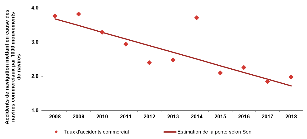 Le coefficient de corrélation tau-b (τb) de Kendall est une mesure non paramétrique de la force et de la direction d'association qui existe entre deux variables. On a calculé le τb de Kendall pour la série de valeurs des taux d'événements par année, de 2008 à 2018. Il y avait une forte corrélation négative qui indique une tendance à la baisse du taux d'événements par 1000 mouvements de navire au cours de cette période (τb = −0,7091, p = 0,0024). La pente estimée selon la méthode de Sen, soit l'ampleur du changement à la baisse du taux par année, était de −0,196 événement par 1000 mouvements de navire de commerce canadiens par année (figure 6).