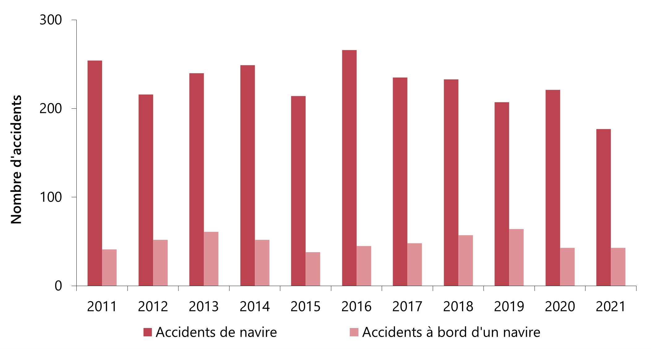 En 2021, on a recensé 11 pertes de vie signalées, en baisse des 18 pertes de vie signalées en 2020 et en deçà de la moyenne décennale de 15,6 (2011–2020). De ces 11 pertes de vie en 2021, 9 ont été liées à 4 accidents de navigation, tandis que les 2 autres étaient liées à des accidents à bord de navires (figure 2).