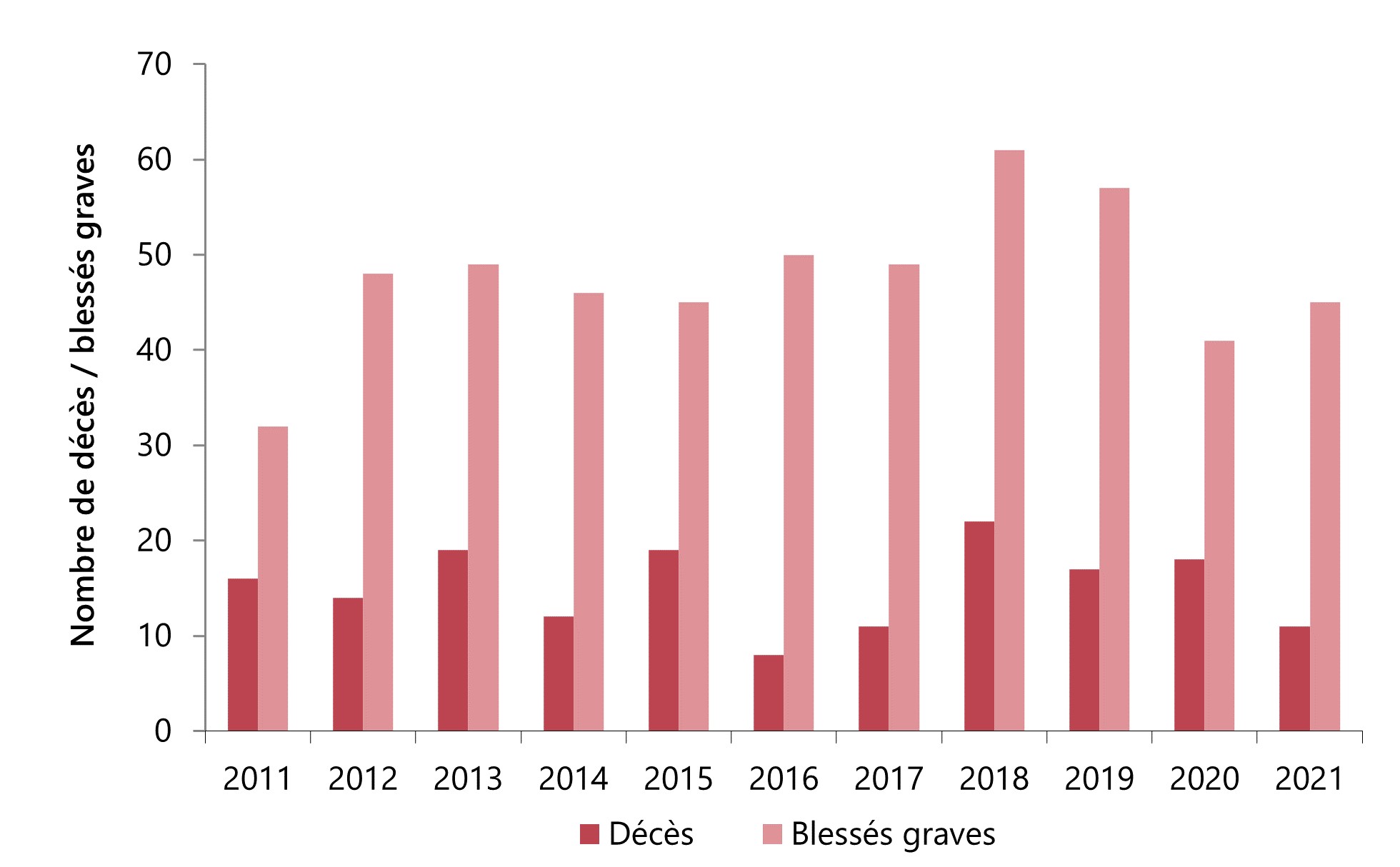| Personnes mortellement blessées dans des accidents à bord d'un navire | 13 | 9 | 8 | 8 | 6 | 1 | 7 | 8 | 12 | 6 | 2 |