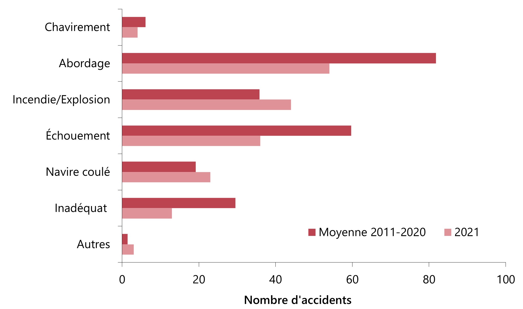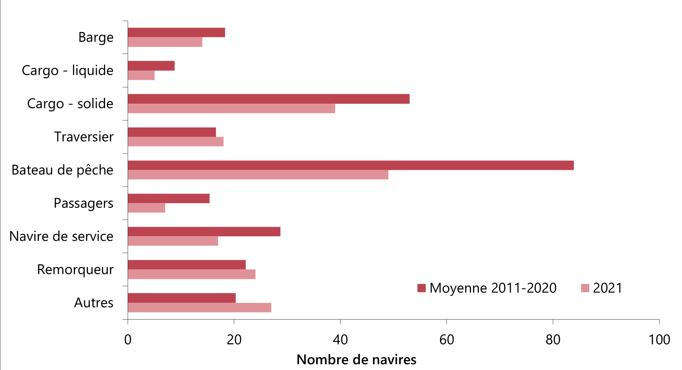 On a enregistré 177 accidents de navigation en 2021, un nombre inférieur à celui de 2020 qui était de 221 et inférieur de 24 % à la moyenne de 2011 à 2020 (234). La plupart des accidents de navigation mettaient en cause des bateaux de pêche (25 %) et des navires qui transportent des cargaisons solides (21 %) (données non présentées).