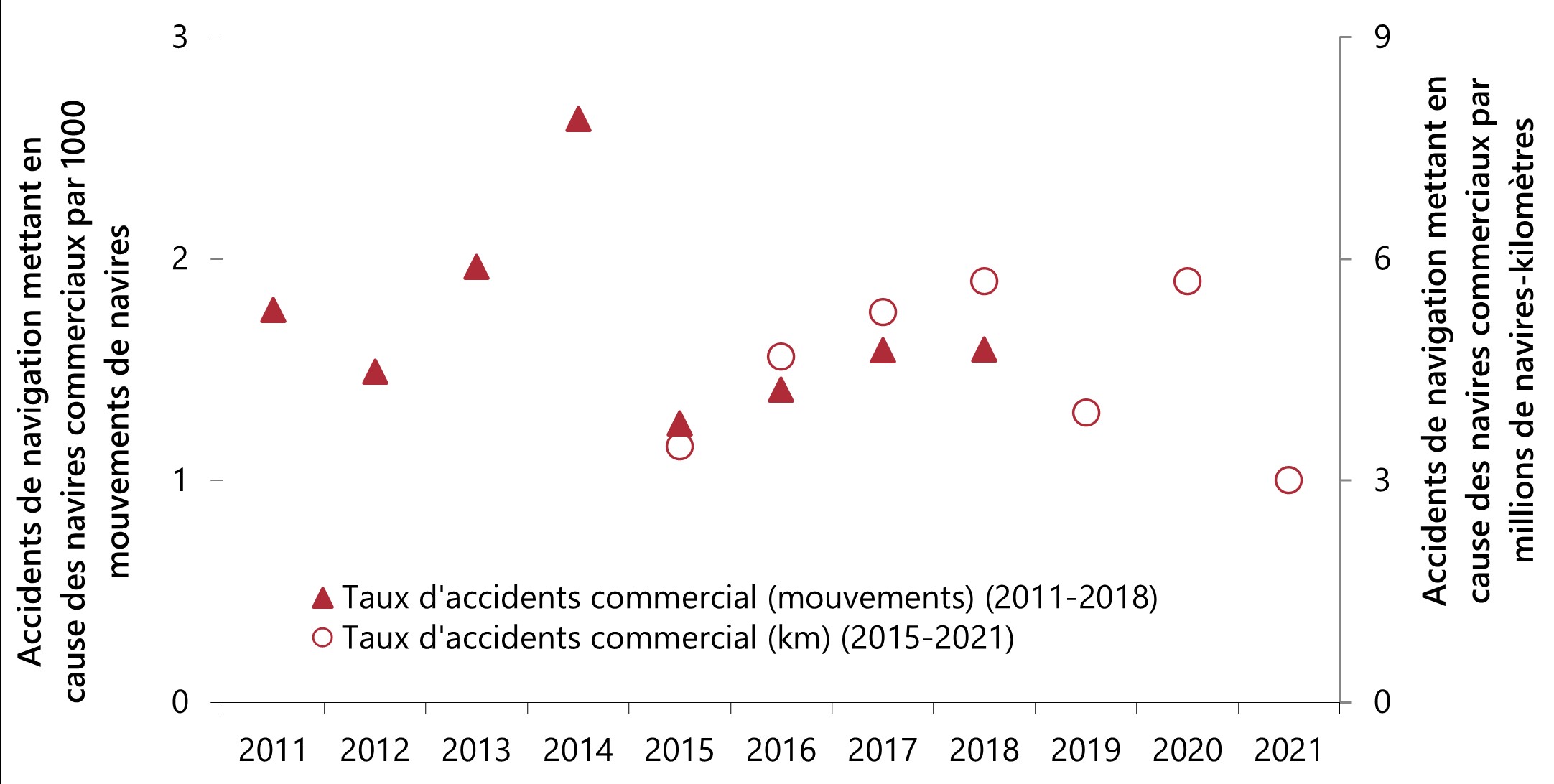 D’après les renseignements fournis par Transports CanadaNote de bas de page 3, l’activité maritime des navires de commerce canadiens autres que des bateaux de pêche dont la jauge brute est de plus de 15 (à l’exclusion des navires à passagers et des navires de croisière) a été estimée à 12 309 milliers de navires-kilomètres commerciaux en 2021. Cela constitue une hausse de 7 % comparativement à la moyenne de la période 2015–2020Note de bas de page 4. En 2021, le taux d’accidents s’est donc établi à 3,0 accidents de navigation par million de navires-kilomètres, en baisse comparativement à la moyenne des 6 années précédentes (4,8). (Remarque : une suite de 7 ans est trop courte pour effectuer des tests afin de déterminer des tendances.)