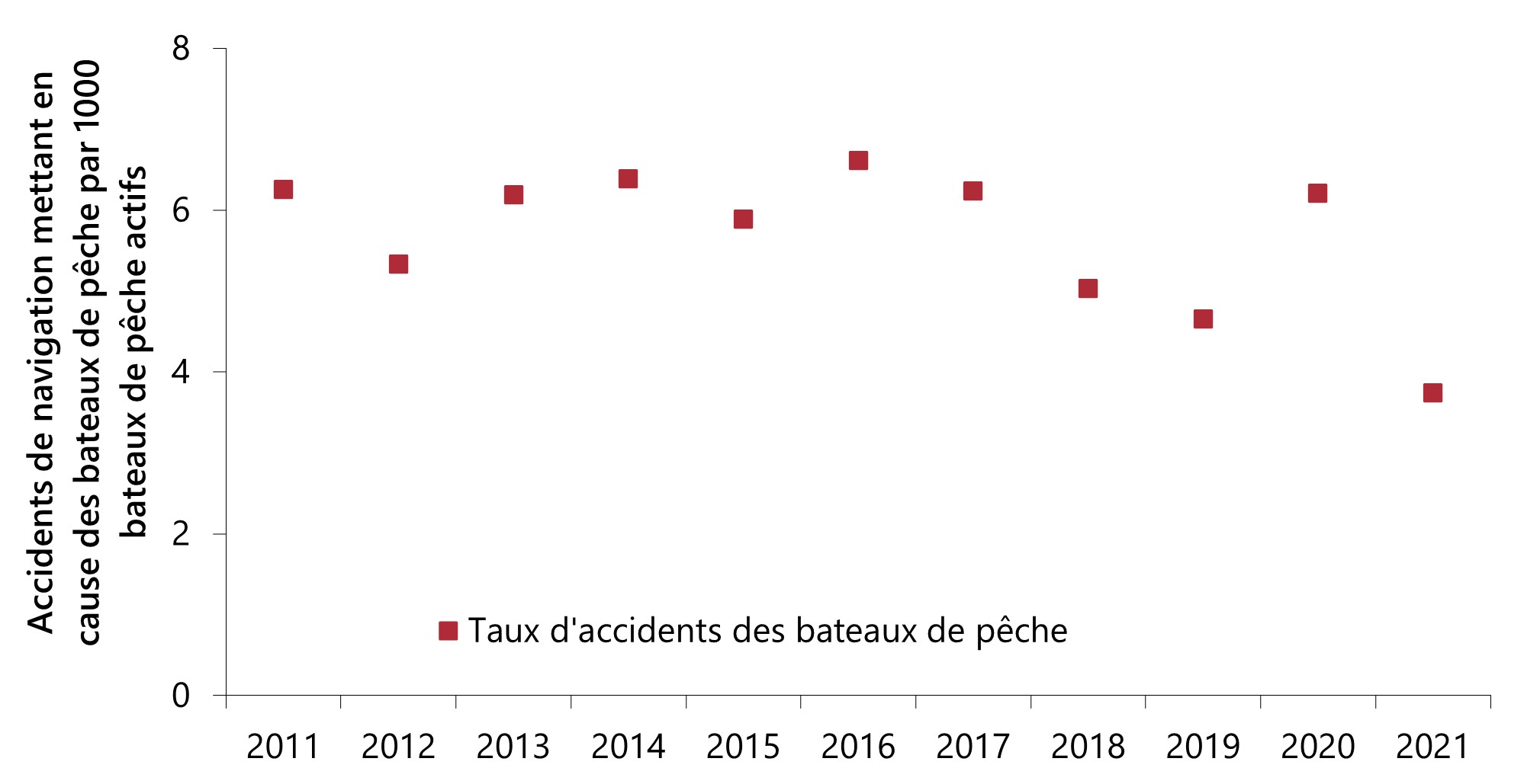 Quarante-neuf bateaux de pêche ont été en cause dans des accidents de navigation en 2021, en baisse par rapport à 2020 (77) et en baisse par rapport à la moyenne de 2011 à 2020 (84) (figure 4). Les bateaux de pêche représentaient un quart du nombre total des navires en cause dans les accidents de navigation.