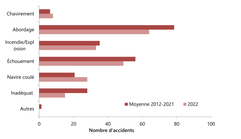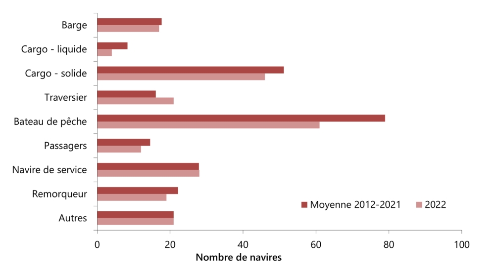 On a enregistré 197 accidents de navigation en 2022, un nombre supérieur à celui de 2021, qui était de 177, mais inférieur de 13 % à la moyenne de 2012 à 2021 (226). La plupart des accidents de navigation mettaient en cause des bateaux de pêche (30 %) et des navires qui transportent des cargaisons solides (23 %) (données non présentées).