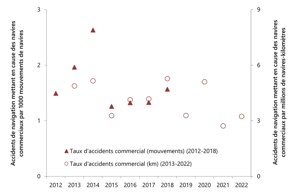 D’après les renseignements fournis par Transports CanadaNote de bas de page 3, l’activité maritime des navires de commerce canadiens autres que des bateaux de pêche dont la jauge brute est de plus de 15 (à l’exclusion des navires à passagers et des navires de croisière) a été estimée à 147 303 millions de navires-kilomètres commerciaux en 2022. Cela constitue une hausse de 10 % comparativement à la moyenne de la période 2013–2021Note de bas de page 4. En 2022, le taux d’accidents s’est donc établi à 3,0 accidents de navigation par million de navires-kilomètres, en baisse comparativement à la moyenne des 9 années précédentes (4,0).