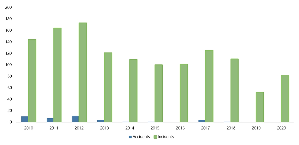 En 2020, 81 événements de transport pipelinier ont été signalés au BST (tableau 1 et figure 1), et aucun d’entre eux ne constituait un accident. Ce nombre est inférieur au nombre moyen d’événements au cours des 10 années précédentes; les écarts dans les nombres signalés au cours de cette période pourraient être dus à une variété de facteurs, dont des modifications à la réglementation et aux définitions. De 2010 à 2019, on a signalé en moyenne 124 événements par année (120 incidents et 4 accidents par année).