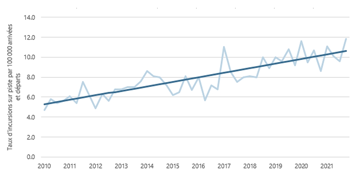Le taux d’incursions sur piste au Canada est passé d’une moyenne de 5,3 incursions par 100 000 arrivées et départs en 2010 à une moyenne de 10,7 en 2021Note de bas de page 1. En 12 ans, ce taux a doublé (ce qui correspond à une augmentation annualisée de 5,9 % par an).