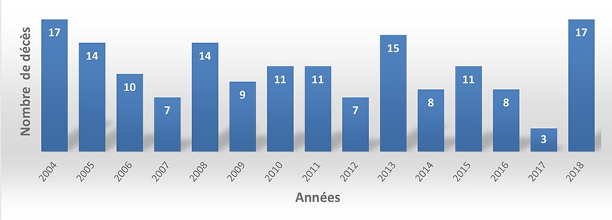 * Nombre de décès au 19 octobre 2018. Source : base de données du BST.